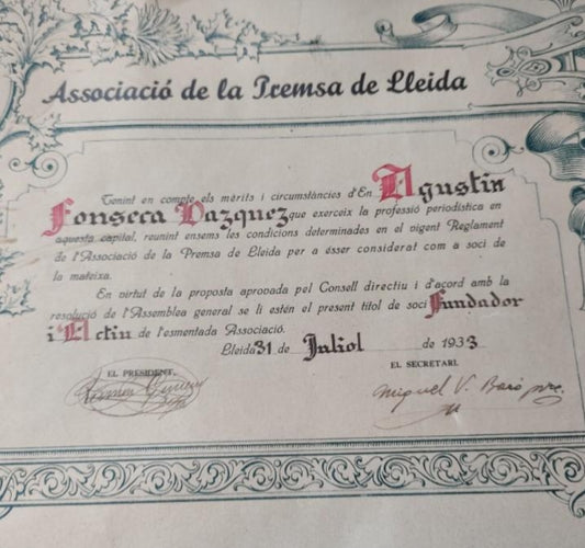 Diploma from the Lérida press association