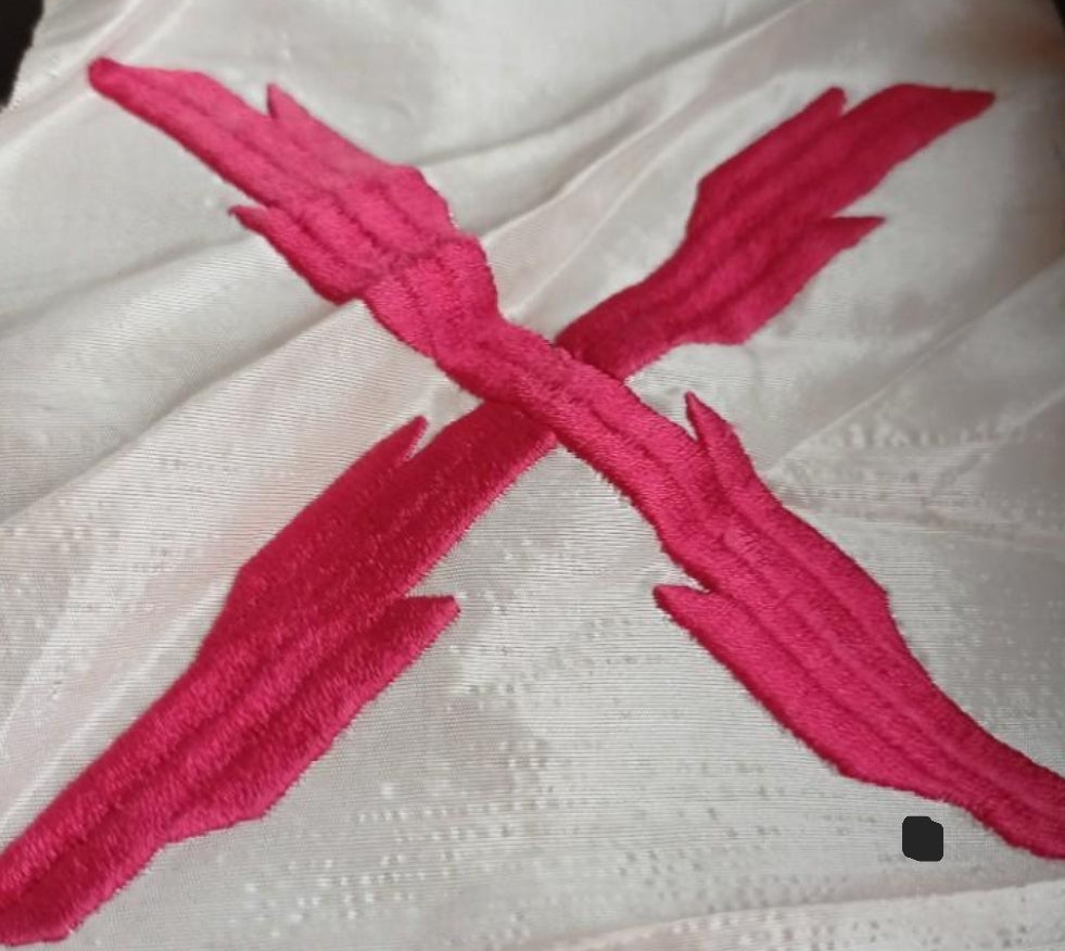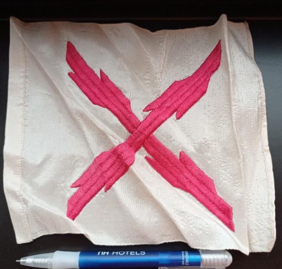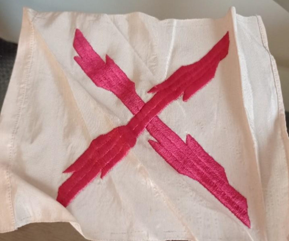 Bordada en seda con hilo rojo carmesí y en buen estado de conservación y posiblemente de la época de la guerra civil o anterior a alguna organización carlista. Gran calidad.