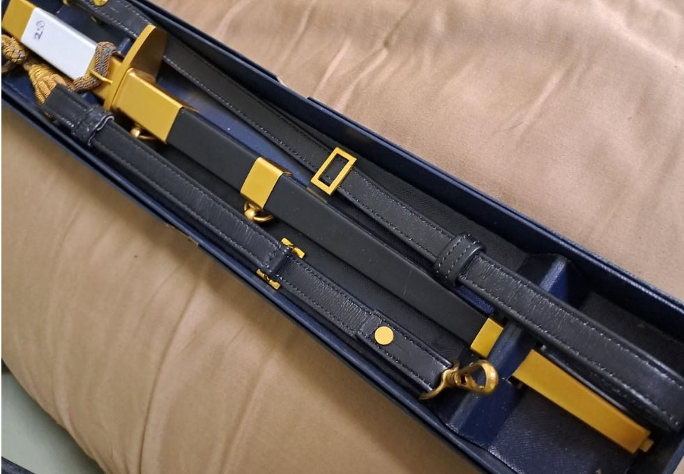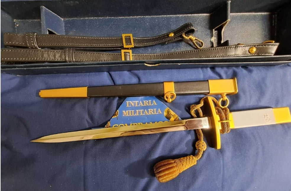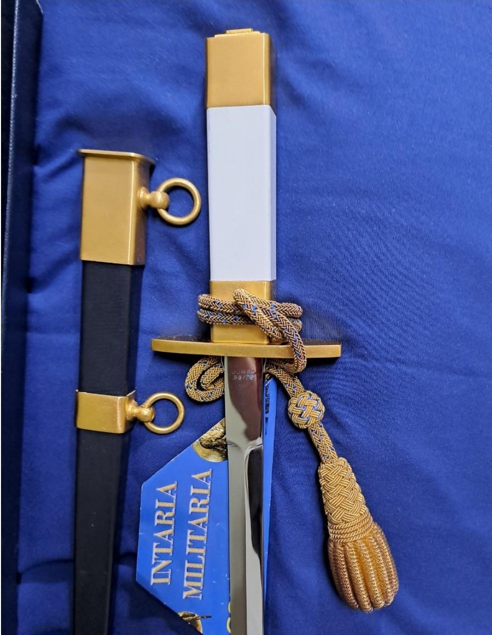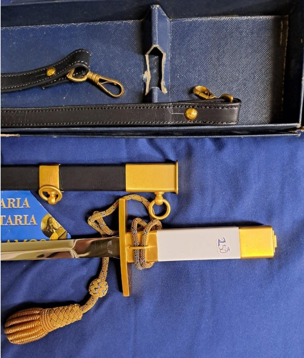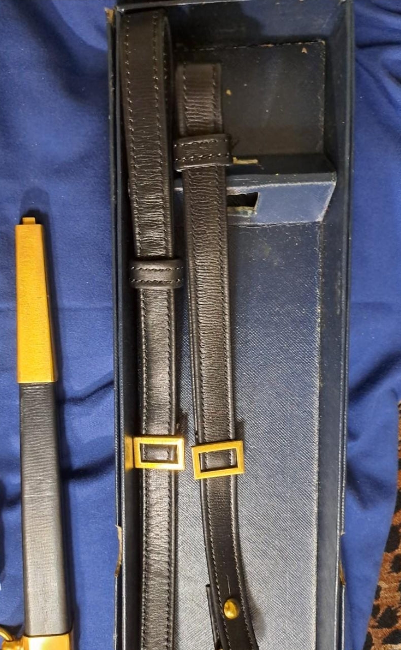 En perfecto estado de conservación con funda y hoja con pavonado original completa con su caja y con los tirantes para oficiales superiores de la aviación militar francesa.