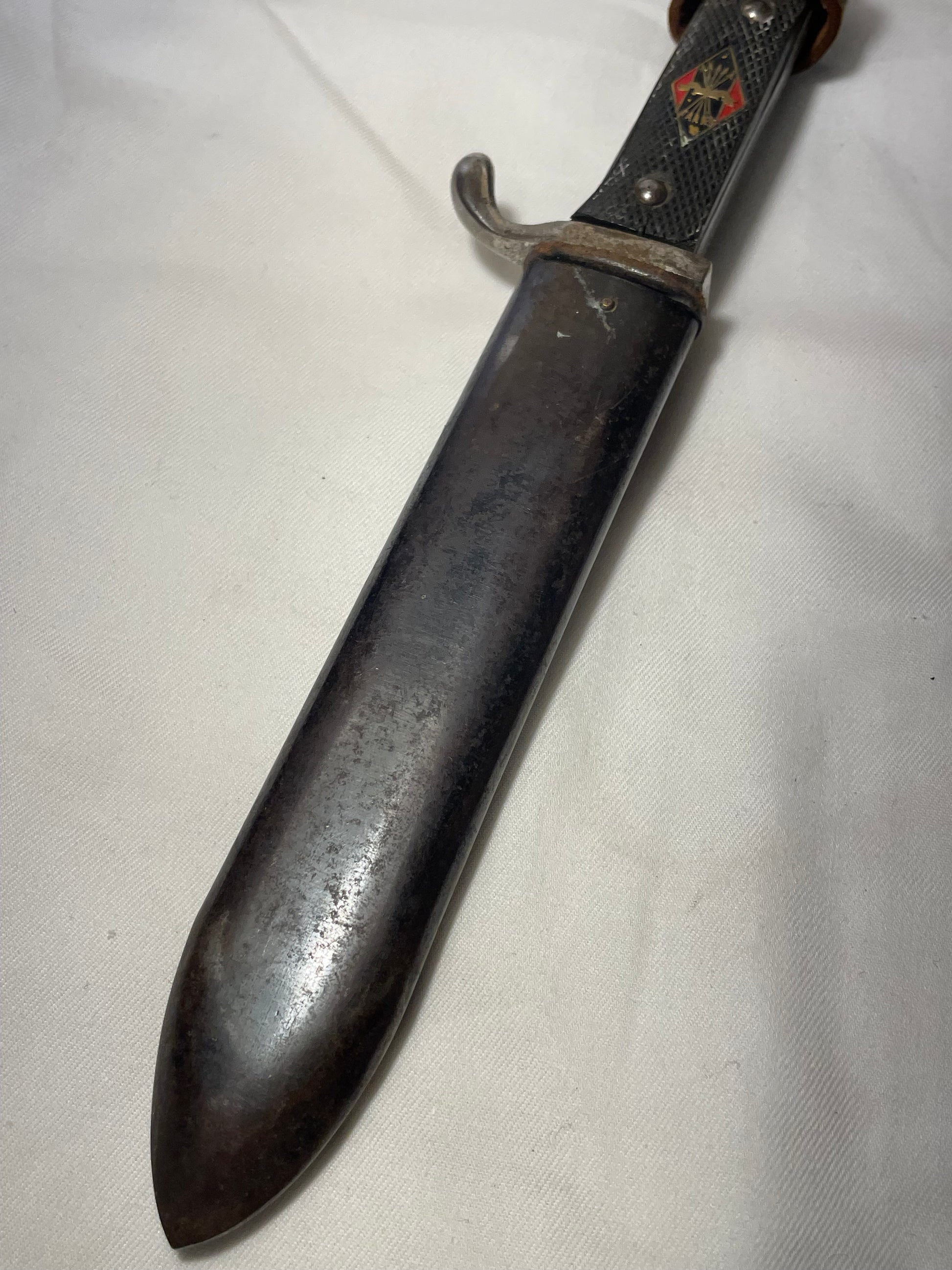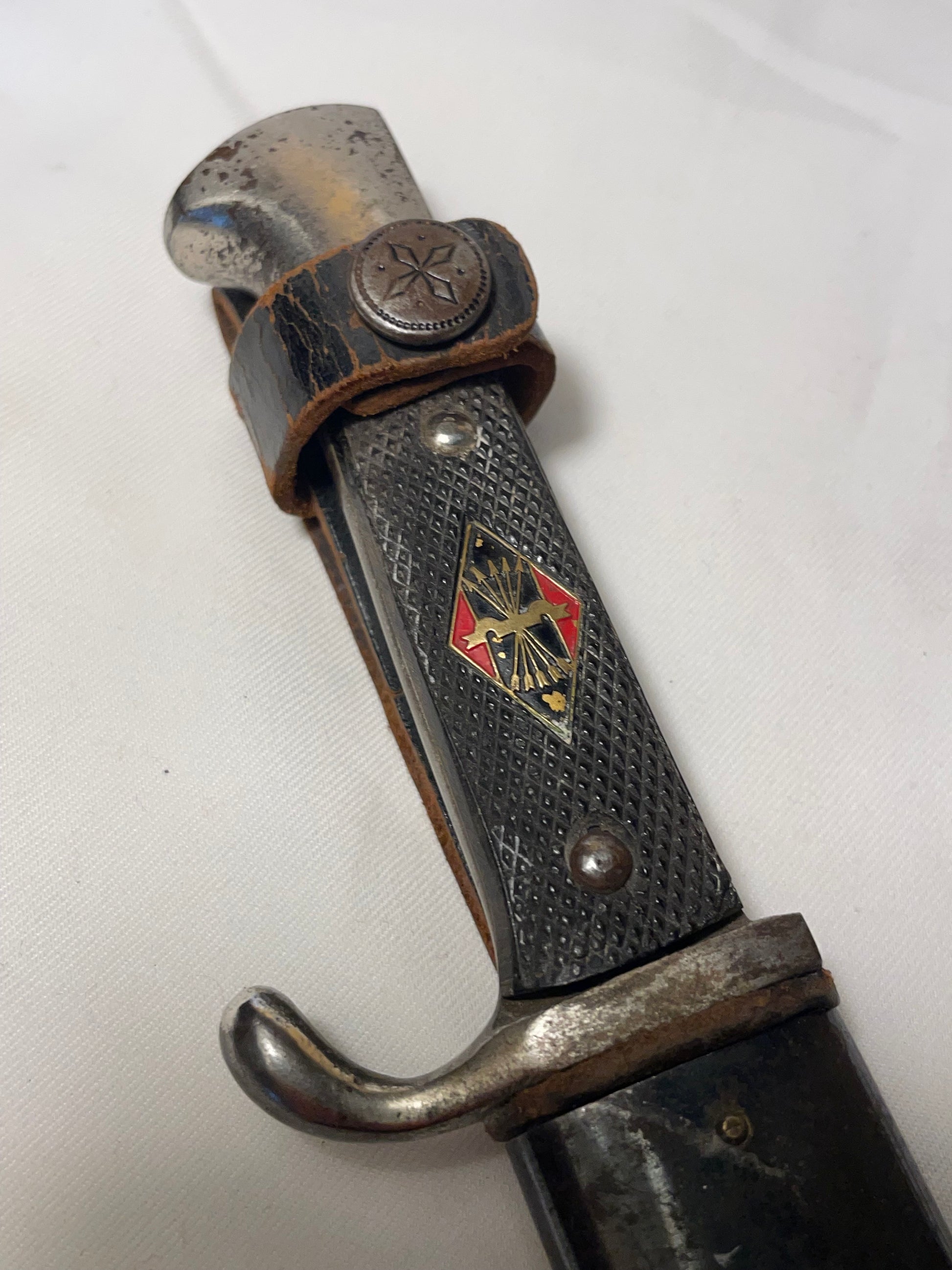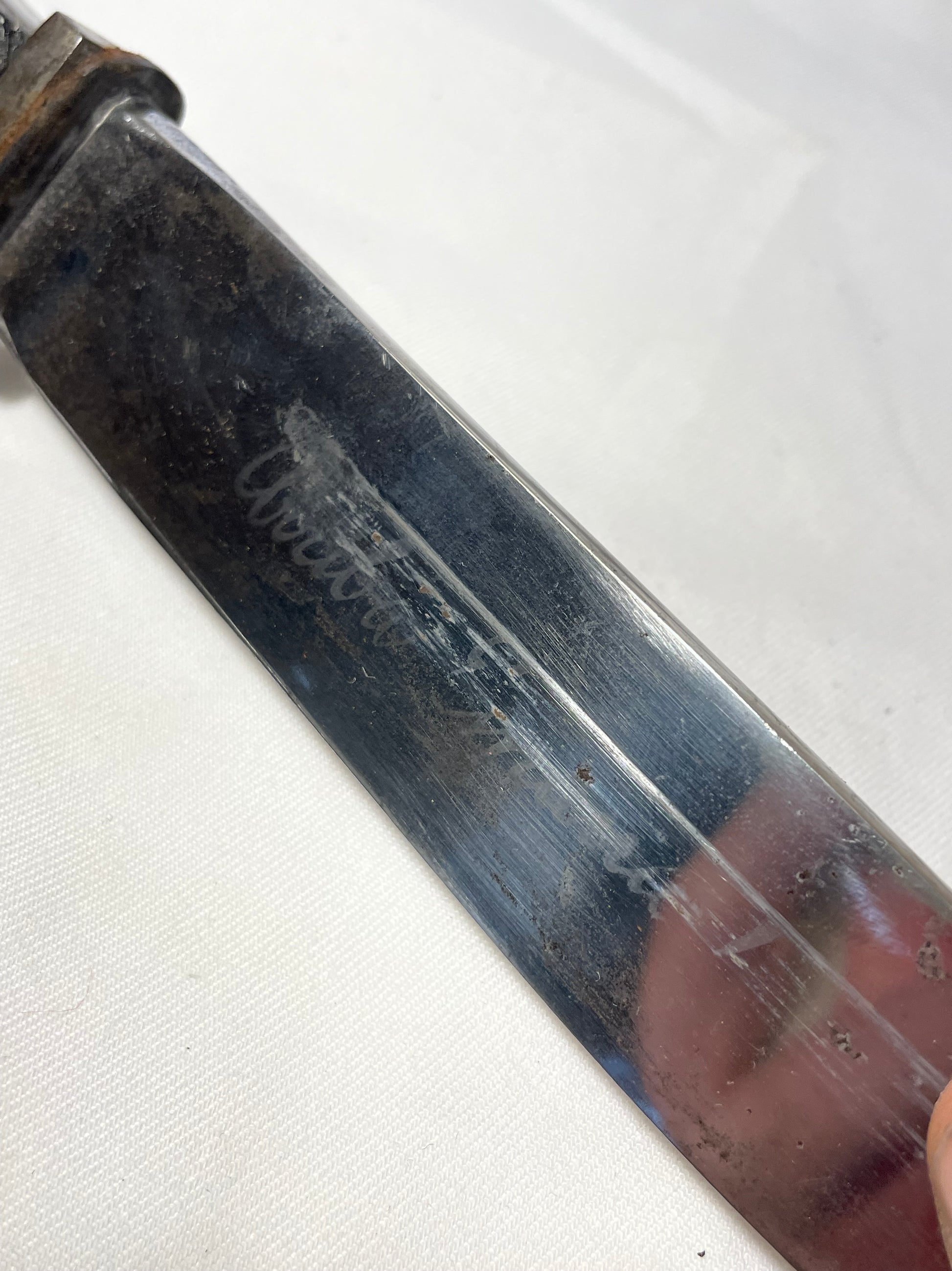 Daga totalmente original de juventudes de Falange con la hoja grabada con marcajes Arriba España y SEAM. En un buen estado, pieza rara
