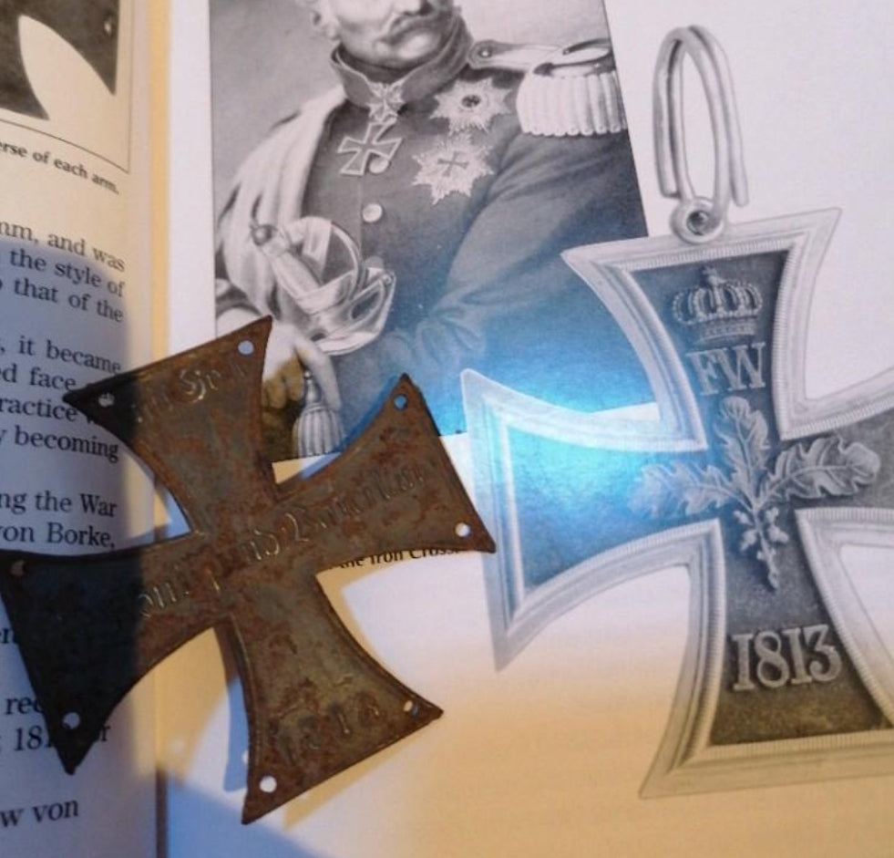 En plancha de hierro adaptado para pasador de gala Anverso con el símbolo de la cruz de hierro alemana y reverso estampado. el texto dice a la victoria por el Rey y la Patria 1813. Utilizado en los conflictos Napoleónicos por la Landwehr o milicia voluntaria sobre el Tschako. Original garantizado