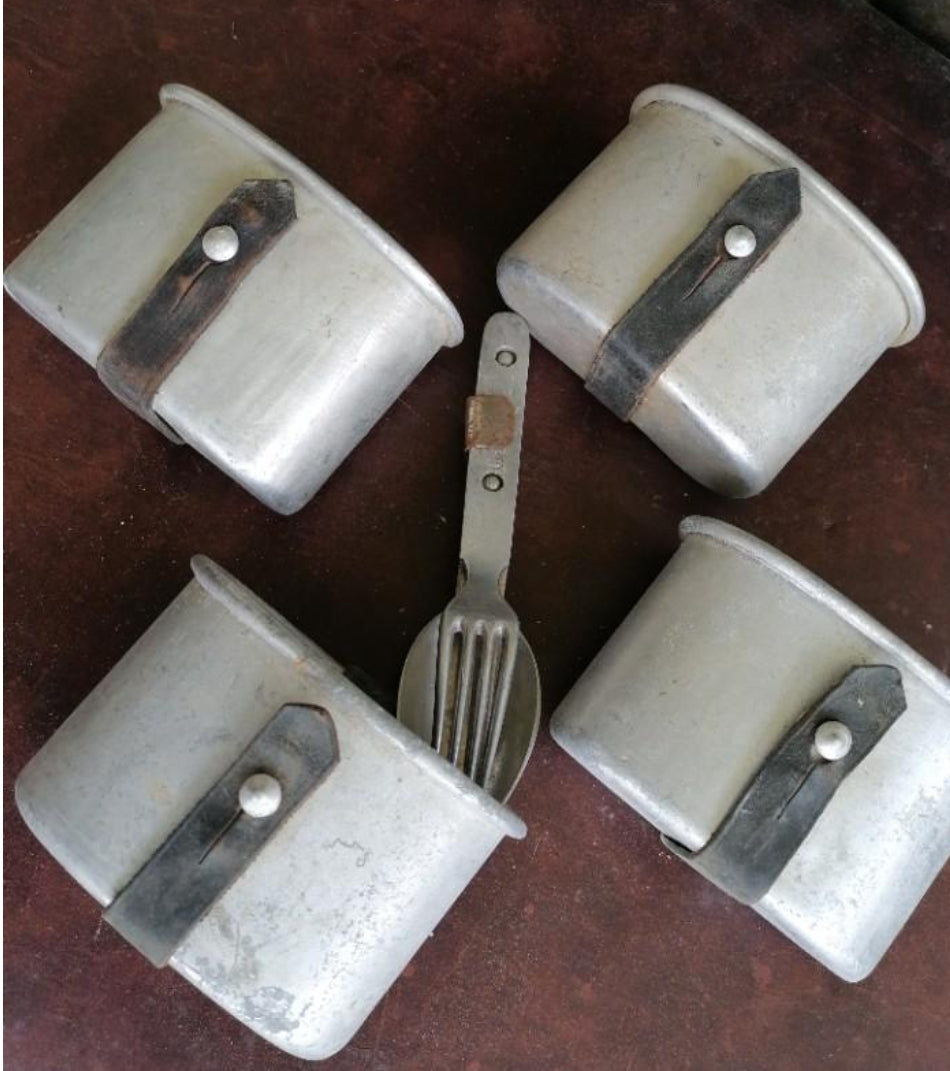 Set of 1 aluminum glass and 1 campaign cutlery consisting of a knife, fork and spoon from the civil war or immediate post-war period. Usable for historical recreations or reenactment