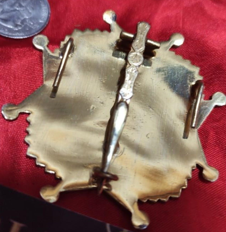 In good condition, enamel and silver gilt and complete with its carved pin. Franco era