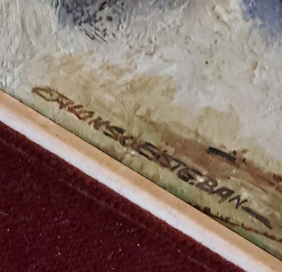 Oil of an aerial battle of the First World War in France with the plane of the famous Baron von Richthofen Made by the painter Alonso Esteban who has extensive work in the Air Museum in Madrid. The painter in turn was a pilot in the Spanish civil war. Approximate measurements of 35 by 30 cm