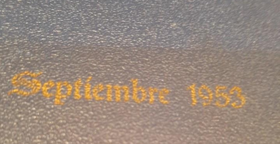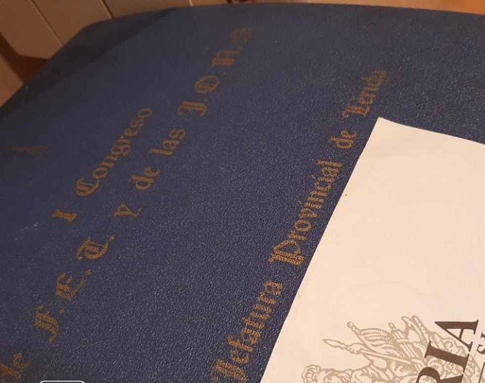 Presentation copy in leather and bound in quality of approximately 45 by 30 cm with the graphic report and annexes with poster and pamphlets of the first Falangist concentration of the Lérida provincial headquarters of Falange. Delivered to a Falangist position