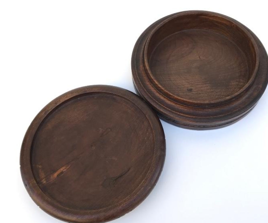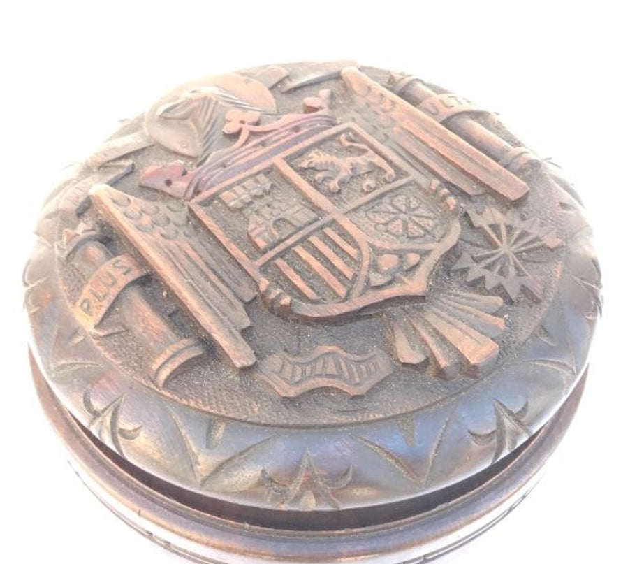 War art from the Franco era. Circular carved box with Spanish shield symbols from the Franco era. Very good condition. 18 centimeters in diameter